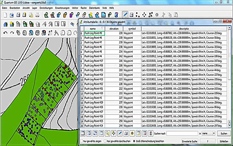 Abb. 6: Integration der Positionsdaten der Entnahmebäume in eine thematische Karte mit Baumverteilung, Abteilungsgrenzen und Feinerschließung und Darstellung der in den Attributtabellen hinterlegten Metadaten. Innerhalb der Open-Source Software QGIS können thematische Karten erstellt und eine Vielzahl geo-statistischer Auswertungen zur Bewertung der eigenen Arbeitstätigkeit durchgeführt werden (Anzahl Entnahmebäume je Hektar, Mittlere Entfernung zwischen den Entnahmbäumen, Stückzahlen und Stückmassen). (Quelle: Quantum GIS)