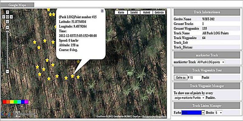 - Da jeder Positionsmessung eine Datum-Uhrzeitgruppe hinzugefügt wird, lässt sich das System zusätzlich zur Zeiterfassung einsetzen. Weiterhin kann die Effizienz der Arbeiten anhand der durch den Revierleiter beim Auszeichnen zurückgelegten Wegstrecken analysiert werden.