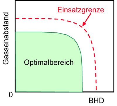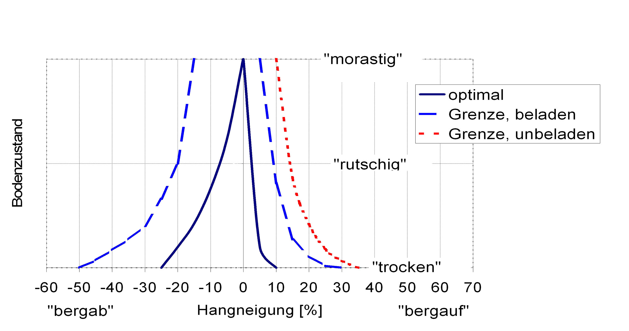 Abbildung 4 ist das Ergebnis einer Einschätzung von Experten zu den technischen Möglichkeiten der Bringung mit dem Forwarder. Im Vergleich zum allgemeinen Beispiel der Abbildung 3 ist der Optimalbereich sehr eng. Das zeigt klar, wie empfindlich Forwarder auf den Bodenzustand reagieren.