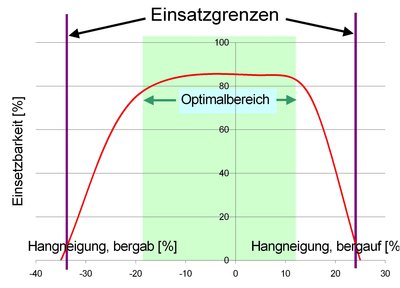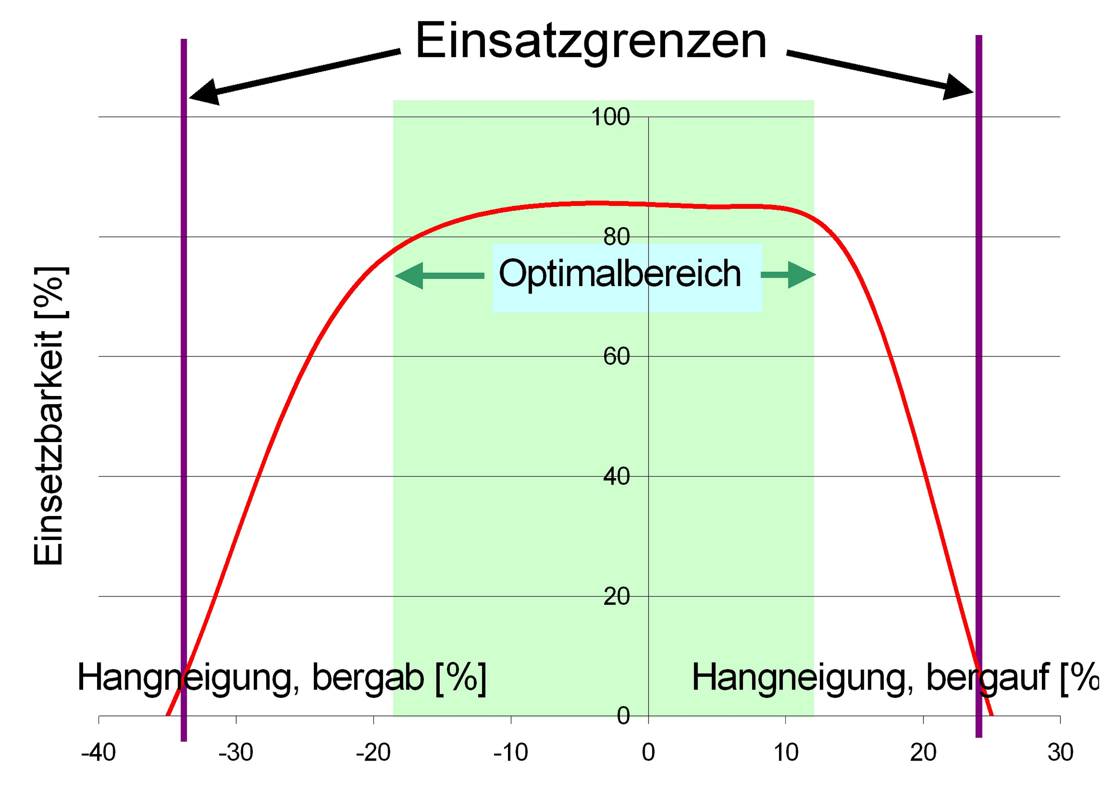 Man kann ein Holzernteverfahren systematisch unter die Lupe nehmen. Dessen Einsatzmöglichkeiten beziehen sich auf bestimmte Holzerntesituationen, die anhand der Art der Hiebsmaßnahme, des Brusthöhendurchmessers, des Gassenabstandes, der Hangneigung etc. beschrieben werden (Abb. 2). Die Einsetzbarkeit gibt an, in wie viel Prozent der Fälle oder mit welcher Wahrscheinlichkeit ein Verfahren in einer bestimmten Situation anwendbar und praktikabel ist. Mit der Einsetzbarkeit verhält es sich ähnlich wie mit der ökologischen Nische eines Lebewesens. Ist die Einsetzbarkeit in einem Bereich einer Einflussgröße am höchsten, so wird von einem Optimalbereich gesprochen. Das heißt jedoch nicht, dass dort die Einsetzbarkeit 100 Prozent erreichen muss. Im Beispiel der Abbildung 2 wird der Einsatz eines Verfahrens in Abhängigkeit der Hangneigung bei Bergauf- und Bergab-Bringung geprüft. Sind mehrere Flächen außerhalb des Optimumbereiches, sollten Verfahrensalternativen geprüft werden.