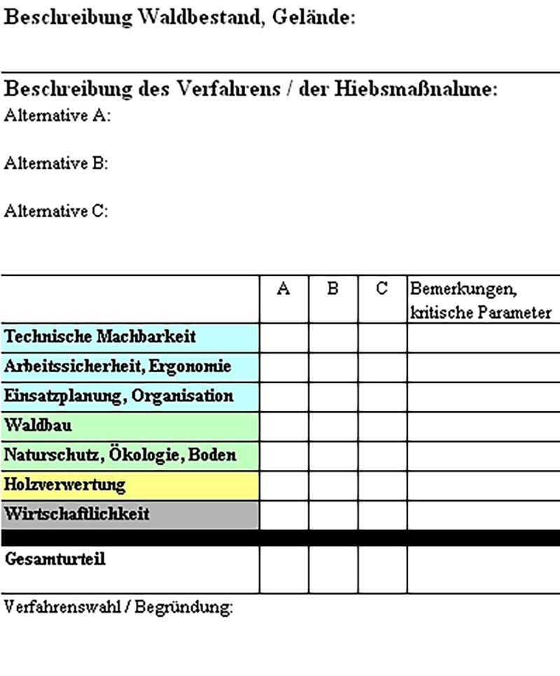 Lässt sich eine Maßnahme rein technisch verwirklichen, so ist sie vielleicht wegen der Bestandesschäden aus waldbaulicher Sicht abzulehnen. Man kann deshalb zunächst versuchen, die Einsetzbarkeit vor Ort nach Beurteilungsdimensionen getrennt abzuschätzen. Eine Hilfe ist die Verwendung einer Tabelle, in der kritische Parameter aus der Sicht von Technik, Ökologie, Ökonomie usw. beurteilt werden (Abb. 5). Wenigstens sieben Punkte sollten dabei berücksichtigt werden: