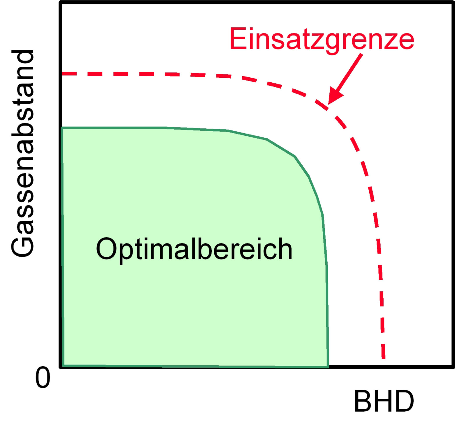 Nicht selten existieren Wechselwirkungen zwischen verschiedenen Größen (Abb. 3). Man denke an den Einfluss des Brusthöhendurchmessers und des Abstandes zur Rückegasse auf die Wahrscheinlichkeit, dass ein Baum zugefällt werden muss (vgl. Beitrag "Motormanuelles Zufällen im starken Nadelholz sehr effizient"). Der Leser möge versuchen, für sich den optimalen Einsatzbereich des reinen Harvesterverfahrens in die dortigen Abbildungen einzutragen. Er wird davon abhängen, welcher Anteil an Stämmen, die ohne Zufällung nicht zu ernten sind, toleriert wird. Muss nennenswert zugefällt werden, so ist die Einsatzgrenze des reinen Harvesterverfahrens erreicht.