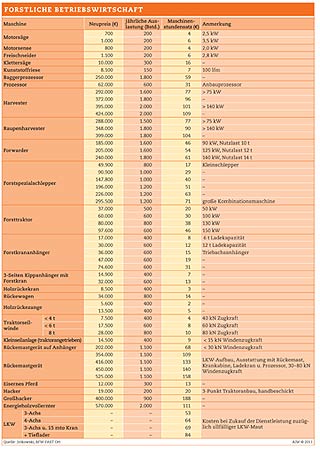 In der Tabelle sind Stundensätze für verschiedene Maschinengruppen in Abhängigkeit von Neupreis (ohne Mehwertsteuer, Stand Jänner 2010) und jährlicher Auslastung ersichtlich. Die Angaben beruhen auf konkreten Maschinendaten und berücksichtigen die kalkulatorische Abschreibung, kalkulatorische Zinsen, Reparatur, Wartung, Treibstoff- und Schmiermittelkosten, jedoch keine Kosten für Maschinisten und Bedienungspersonal.
