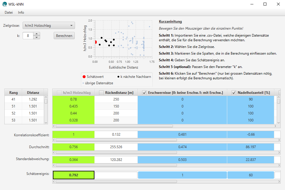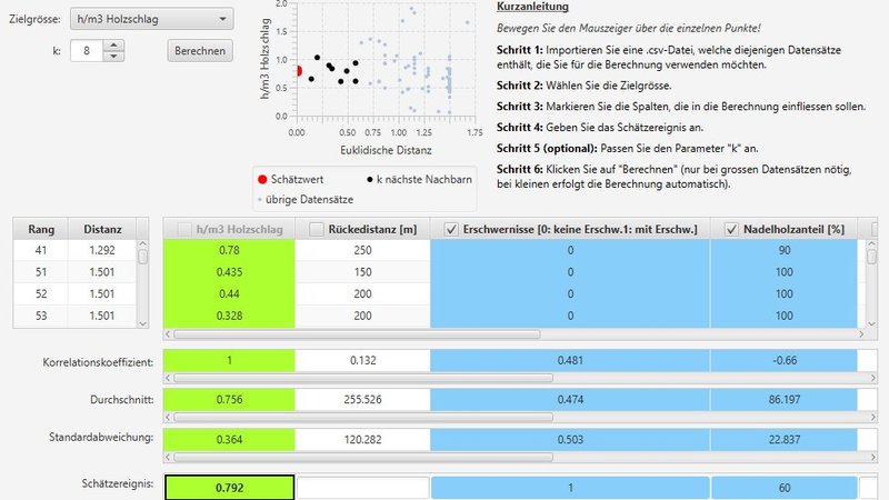 Abb. 2 - Screenshot des neuen Programms WSL-kNN. Die Tabelle zeigt Daten aus früheren Holzschlägen. Spalten, die in die Berechnung einfliessen sollen, werden blau, die Zielgrösse grün hinterlegt. In der untersten Zeile "Schätzereignis" wird anhand bekannter Grössen des zukünftigen Holzschlags die Zielgrösse geschätzt.