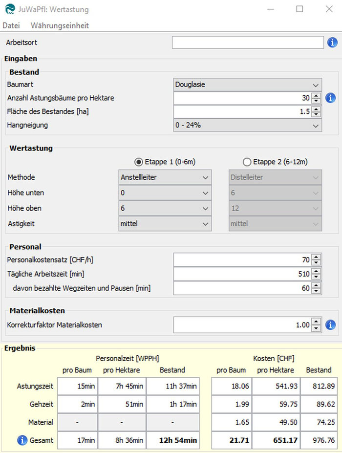 Die Abbildung 2 zeigt die grafische Benutzeroberfläche am Beispiel des Modells für die Wertastung. Die Benutzeroberflächen aller Modelle sind grundsätzlich gleich aufgebaut. Im grau hinterlegten Feld werden die jeweiligen Eingabegrössen eingegeben oder in den Drop-down-Feldern ausgewählt. Im gelb hinterlegten unteren Teil erscheinen die Ergebnisse zu Zeiten und Kosten für die jeweils wichtigen Positionen sowie das Total. Zeiten und Kosten werden in der Regel sowohl pro Einheit (Baum, Bauwerk, etc.) wie auch pro Fläche ausgewiesen. Bei Veränderung einer Eingangsgrösse werden die Ergebnisse automatisch nachgeführt. Damit lässt sich der Einfluss einer bestimmten Eingangsvariablen auf die Zeiten und die Kosten einfach und rasch überprüfen.