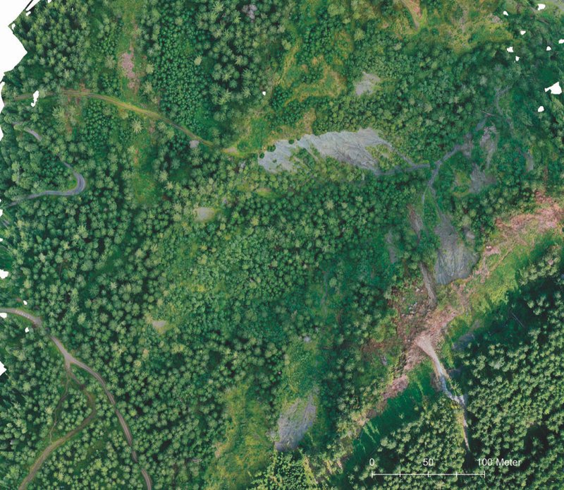 Eine Blaike (=Rutschung) von oben, mithilfe einer BFW-Drohne aufgenommen