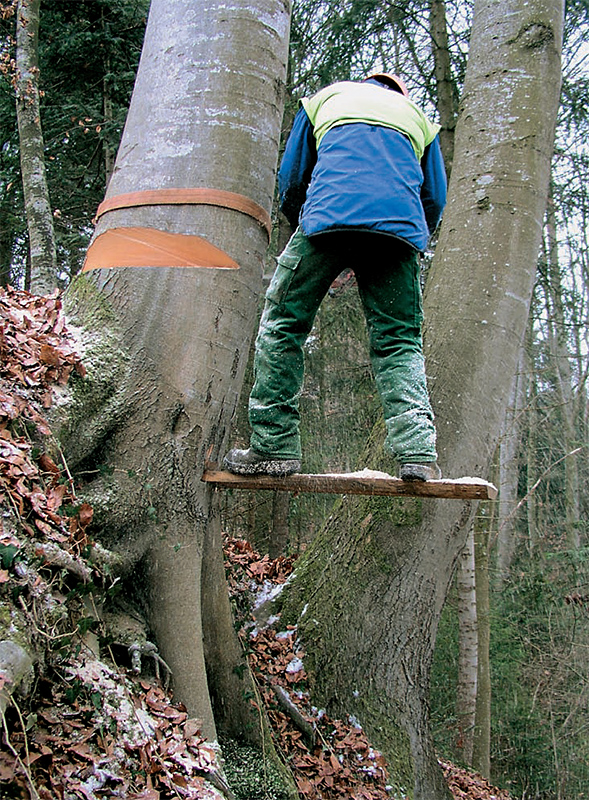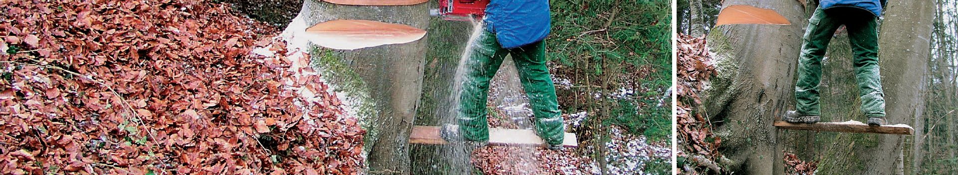 Das eingeführte Standbrett sollte leicht in die Höhe stehen. Durch das Belasten wird es nach unten gedrückt und die Dornen verankern es noch fester. Ein belastetes Sprungbrett, das leicht gegen den Baum hängt, gibt dem Motorsägenführer ein besseres Standgefühl und er fühlt sich sicherer.