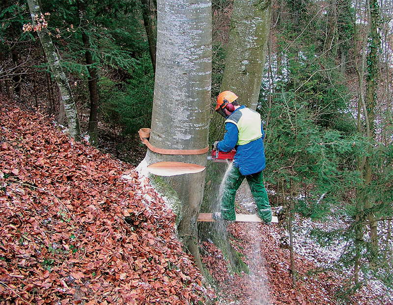 Abb. 4 - Meistens beginnt man den Fällschnitt auf der Sprungbrettseite und beendet ihn wegen der besseren Rückzugsmöglichkeiten vom gewachsenen Boden aus.
