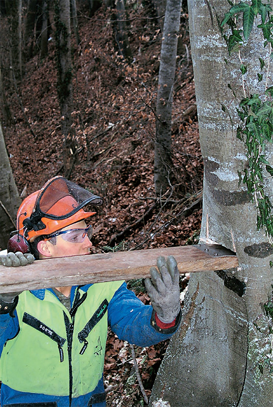 Das Loch, in dem das Brett verankert wird, darf nicht in der Faserrichtung des Bandes des zu fällenden Baumes sein (Abb. 3). Sonst kann es vorkommen, dass das Band beim Fällen ausreisst. Die beiden waagrechten Schnitte werden abwärts gegen das Mark mit der Motorsäge in den Stamm gestochen, so dass sich die beiden Schnitte zirka 20 cm im Baum kreuzen. Mit zwei senkrechten Schnitten kann die Breite des Brettes übertragen und der Keil in der Kerbe gelöst werden.