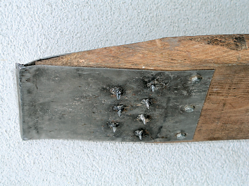 Abb. 2 - Ein Standbrett mit metallverstärkter Spitze. Die Kante oben wird unter Last ins Holz gepresst, die unterseitig angeschweissten Dornen verhindern ein seitliches Wegrutschen.