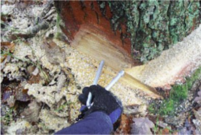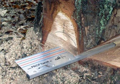 Eine exakte Ausformung der Bruchleiste hat bei der Fällung einen grossen Stellenwert, weil sonst die Fällrichtung ungenau wird und die Gefahr von Unfällen steigt. Aus dem gleichen Grund ist auch bei der Anlage der Bruchstufe und beim Fällschnitt Massarbeit gefragt. Geeignete Hilfsmittel gab es dazu allerdings bisher nicht. Nur durch viel Übung und ein gutes Einschätzungsvermögen war es bislang möglich, Bruchleiste und Bruchstufe in den geforderten Massen anzulegen. Mit Hilfe von Fällzirkel und Fällfahne ist das exakte Fällen keine Glückssache mehr.