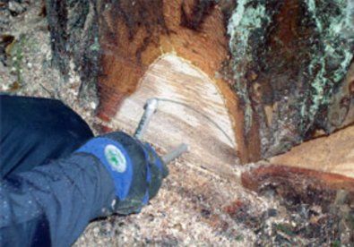 Diese Stelle wird nach dem gleichen Vorgehen auch auf der anderen Seite des Baumes eingezeichnet. Damit sind Bandbreite (Bruchleistenbreite) und Fällschnitthöhe (Bruchstufe) klar vorgegeben. Am besten geht das Anzeichnen, wenn der Baum vorher gut angeschrotet oder sogar in Kastenform gebracht worden ist.