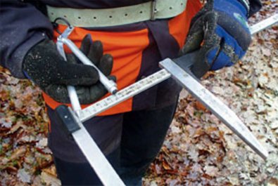 Abb. 2. Einstellen des Fällzirkels, nachdem der Durchmesser der Stammwalze per Messkluppe ermittelt wurde. Empfohlen sind 15% des Durchmessers plus 1 cm als Sicherheitsmass.