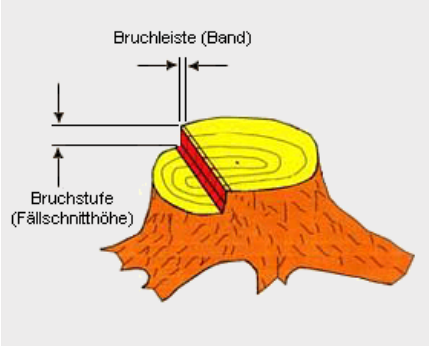 Die sogenannte Bruchleiste dient dazu, dass der fallende Baumstamm wie an einem Türscharnier geführt genau in die gewünschte Richtung fällt. Die Holzfasern knicken dabei von der Fallkerbsehne nacheinander in Richtung Bruchstufe ein, und der Baum kippt regelrecht nach vorne in die Fallrichtung. Der Baum wird von der Bruchleiste geführt und die geknickten Holzfasern reissen erst auseinander, wenn das Fallkerbdach auf der Fallkerbsohle auftrifft.