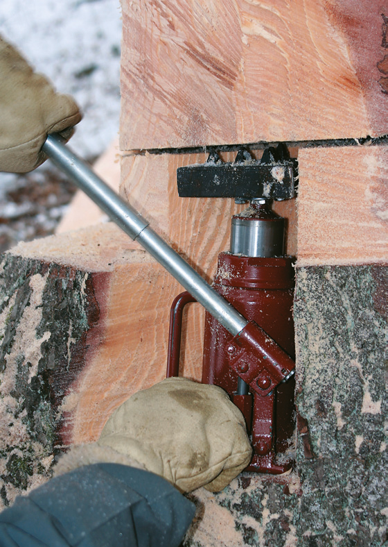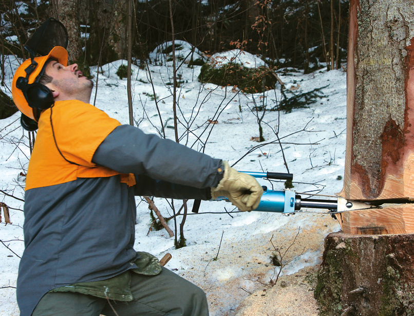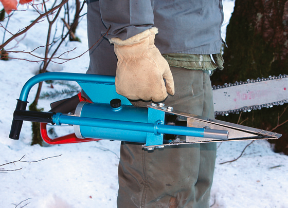 Abb. 3. Die hydraulischen Fällhilfen erleichtern das Keilen und machen diese Arbeit sicherer. Den Seilzug ersetzen sie jedoch nicht.
