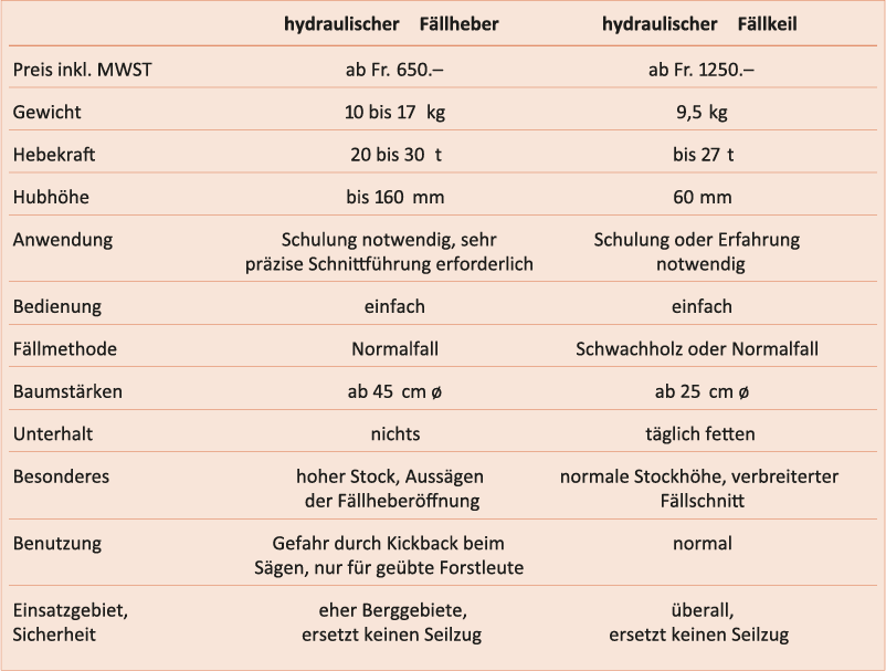 Tab. 1. Eigenschaften und Einsatzbesonderheiten von Fällheber und Fällkeil