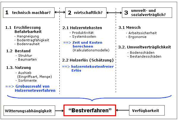 In den letzten Jahren ist im Zusammenhang mit Holzernteverfahren vermehrt der Begriff "Bestverfahren" aufgetaucht. Darunter wird häufig das für den Waldbesitzer kostengünstigste Holzernteverfahren verstanden. Die Kosten sind wohl in vielen Fällen ein wichtiger, oft der wichtigste Faktor, jedoch nicht der einzige. Ein "Bestverfahren" kann man auch als optimales Verfahren bezeichnen, das heisst ein Verfahren, das die Ziele unter den herrschenden Rahmenbedingungen am besten erfüllt. Zu diesen Rahmenbedingungen gehören: