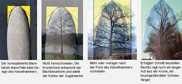 Entsprechend ertragen auch Baumkronen Starkregen und Schneelast am besten, wenn sie wie aufrechtstehende Bachkiesel geformt sind. Claus Mattheck warnt allerdings vor einem dogmatischen Gebrauch der Schnittschablone. Der Kieselhammer sei eine Entscheidungshilfe für Kronenschnitte, bei denen stets die Besonderheiten eines jeden Baumes beachtet werden müssten.