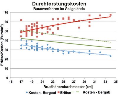 Bei der Bergaufseilung kann man den Ausgleichspunkt derzeit ab Durchmessern um BHD 18 cm des ausscheidenden Bestandes erreichen. Bei stärkeren Durchmessern sind die Erträge höher als der Aufwand (siehe Abbildung 6).