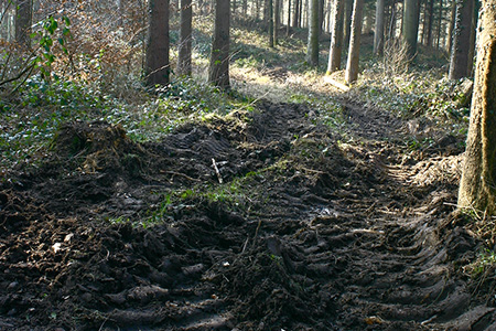 Beim Vorliefern mit Schlepper werden schwächere Bäume oft zusammen gerückt. Dies hat zur Folge, dass das Baumbündel sperriger wird. Die Wahrscheinlichkeit, an einem gesunden, stehenden Baum einen Schaden zu verursachen ist höher. Außerdem steht beim Vorliefern mit Schlepper die Maschine stets auf der Rückegasse. Von dort aus werden so viele Seillinien wie möglich bearbeitet. Das sind nach Beobachtungen in der Regel 1-3 Linien. Können weitere Bäume nicht mehr erreicht werden, muss der Schlepper umgesetzt werden. Durch die Gassenbreite von ca. 3,5 m gestaltet sich das Rangieren auf der Gasse schwierig. Oft muss der Schlepper also ein Stück in den gegenüberliegenden Bestand einfahren, um zu wenden oder sich neu positionieren zu können. Damit sind in den Gassenrandbereichen Bodenverdichtungen oder Wurzelschäden oftmals nicht zu vermeiden.