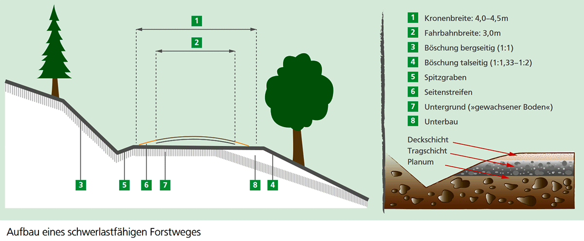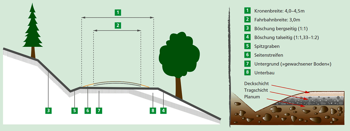 Die oberste Deckschicht des Wegebaukörpers wird aus verwitterungsbeständigem 0/11 bis 0/32 Wegebaumaterial hergestellt. Die Deckschichtbreite entspricht der Fahrbahnbreite und beträgt in der Regel drei Meter. Die Tragschicht umfasst zusätzlich die Seitenstreifen und entspricht daher der Kronenbreite von vier bis viereinhalb Metern. Sie besteht in der Regel aus einer verdichtbaren Gesteinsmischung in der Korngröße 0/32 bis 0/56. Unter der Deck- und Tragschicht befindet sich das Wegeplanum. Darin sind Wasserdurchlässe und Seitengräben integriert. In Hanglagen muss das Planum auf mindestens zwei Dritteln seiner Breite auf dem festen "gewachsenen" Boden liegen. Die beidseitige Böschung wird mit einer maximalen Neigung von 45 Grad angelegt. Die talseitige Böschung sollte aus Stabilitätsgründen etwas flacher angelegt werden.