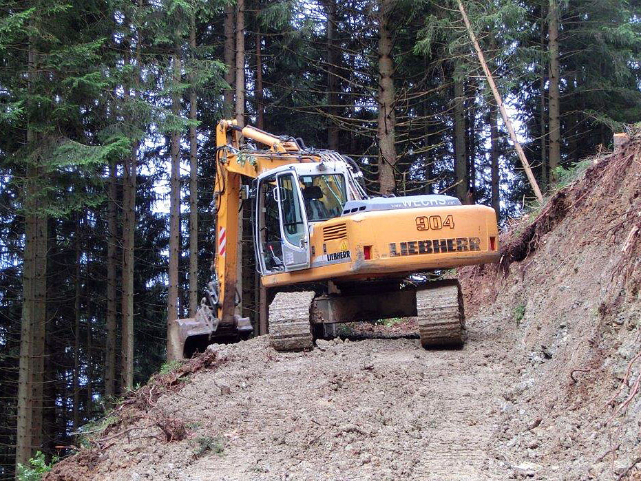Rohplanum, Böschung, Gräben: Nachdem die Stöcke der gefällten Bäume gerodet wurden, werden mit einem Kettenbagger Planum, Böschung und Gräben profiliert.