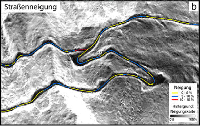 Da ALS-Daten in der Regel sowohl den Waldboden als auch die Kronenoberfläche beschreiben, kann mit ihnen die Geometrie von Forststraßen ausgezeichnet abgeleitet werden. Eine bereits in der Vergangenheit vielfach eingesetzte Digitalisierungsgrundlage stellt dabei das Beleuchtungsbild des Geländemodells dar. Die gute Erkennbarkeit von Straßen spiegelt sich anhand der aus dem Geländemodell abgeleiteten Neigungskarte (Abbildung 2b) wider, wobei Straßen meist durch eine geringere Neigung im Bezug auf deren unmittelbare Umgebung charakterisiert sind.