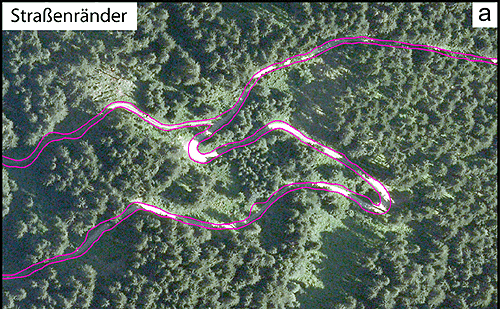 Speziell im steilen Gelände können Straßenflächen damit bereits gut klassifiziert werden. Hingegen sind die Ergebnisse für Bereiche mit geringer Neigung mit diesem Ansatz alleine nicht zufriedenstellend ausweisbar. Daher kann speziell für ein derartiges Gelände optional das Orthophoto für die Klassifizierung von Straßenflächen herangezogen werden.