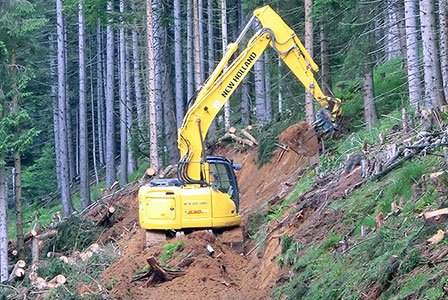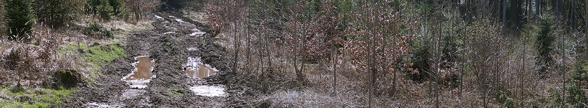 Eine weitere Möglichkeit ist die Befestigung mit wasserdurchlässigem Grobschotter (= Schroppen). Der Ausbau sollte jedoch auf das unbedingt notwendige Maß begrenzt werden und lediglich mit geeignetem Gesteinsmaterial erfolgen. Die sogenannte »Salami-Taktik« mit dem wiederholten stückweisen Ausbau von unbefestigten Rückegassen zu ausgebauten Rückewegen kann im Widerspruch zu verschiedenen Gesetzgebungen (z.B. Waldgesetz, Bodenschutzgesetz, Wasserrecht, Naturschutzrecht) stehen und sollte daher unbedingt verhindert werden.