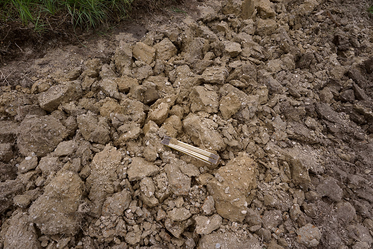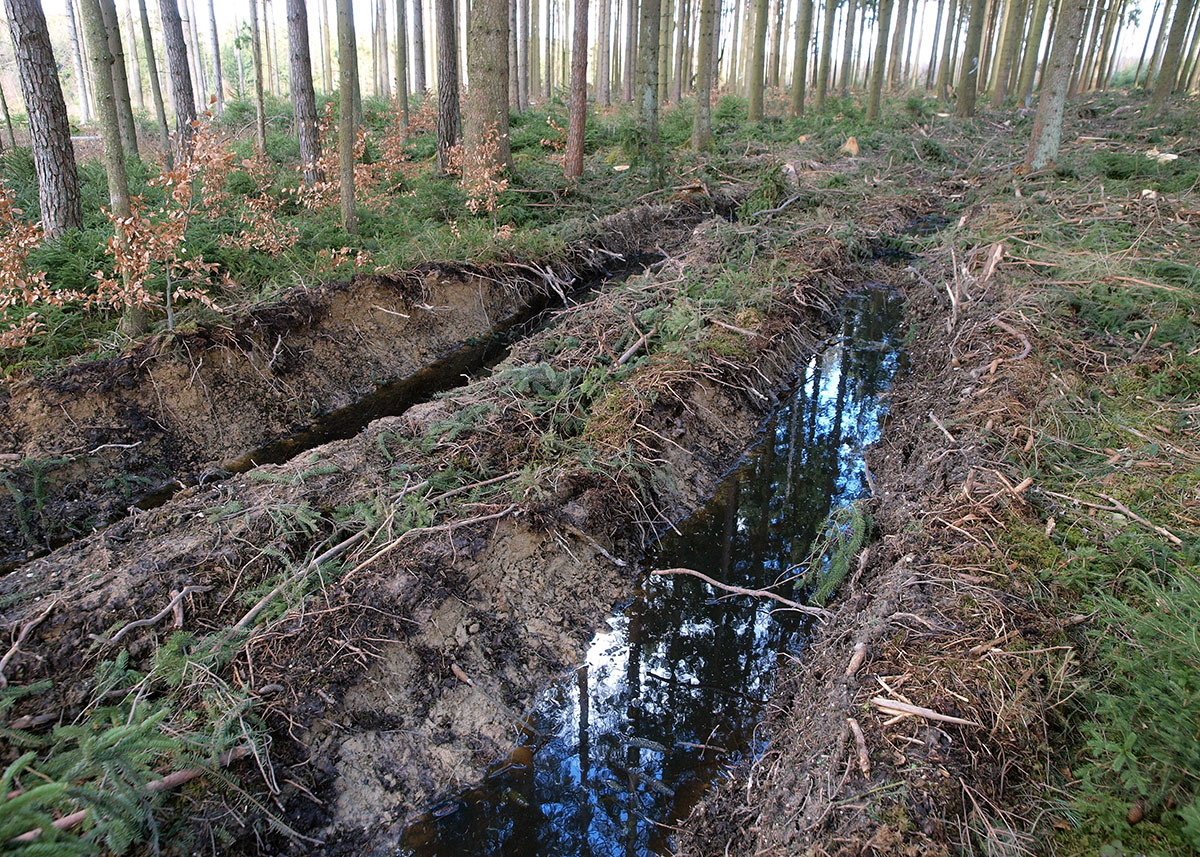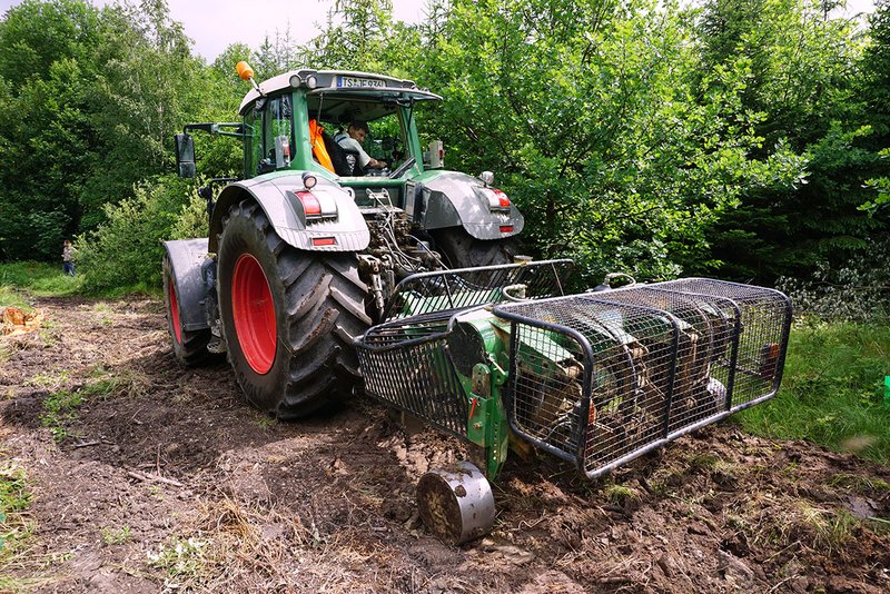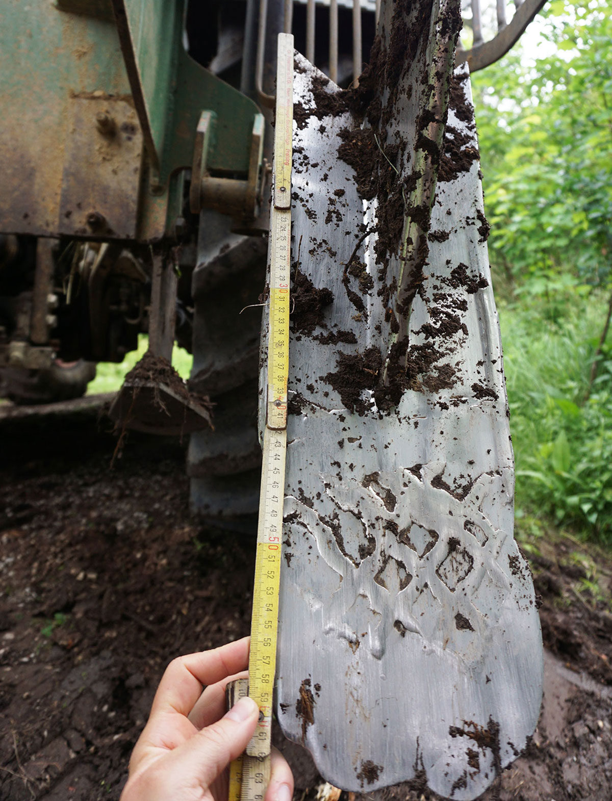 Im Gesamten wurden drei ähnlich stark beschädigte Rückegassen auf einer Länge von je 60 m in einem laubholzdominierten Jungbestand auf lehmig tonigem Substrat saniert. Im ersten Schritt wurden tiefe Fahrspuren und Schadstellen mithilfe eines Kettenbaggers eingeebnet und stehendes Wasser seitlich abgeleitet. Nachfolgend wurden die wiederhergestellten Gassen mit dem »Aufbruchlockerer« OWR MM 100 (Abb. 2) mechanisch bis in eine Tiefe von 50 cm gelockert. Sowohl vor als auch fünf Monate nach der Sanierungsmaßnahme wurden verschiedene bodenphysikalische Eigenschaften wie Lagerungsdichte, Eindringwiderstand, Porenraumverteilung und Wasserdurchlässigkeit gemessen, um den kurzfristigen Effekt im Bodengefüge zu quantifizieren.