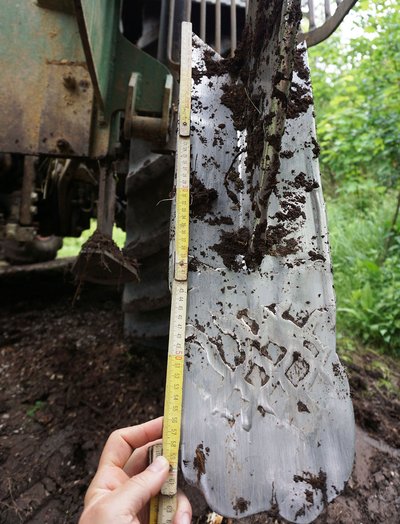 Der "Aufbruchlockerer" des Herstellers OWR (Abb. 2) verfügt über vier Spaten, die bei einer Fahrgeschwindigkeit von ca. 0,8 km/h in den verdichteten Boden einstechen und diesen lediglich leicht anheben. Das Bodengefüge wird dabei nicht durchwühlt und die Bodenschichten bleiben weitgehend erhalten (Abb. 6). Die Spaten haben eine Breite von 20 cm und eine Länge von bis zu 90 cm (Abb. 5). Entscheidend für eine erfolgreiche Lockerung ist eine niedrige Bodenfeuchte, die nach Möglichkeit maximal im Bereich der Feldkapazität (pF > 2,5) liegen sollte. Die einstechenden Spaten brechen den verdichteten Boden in einem Abstand von 10 bis 20 cm auf und schaffen tiefe Grobporen zur Förderung von Wurzelwachstum, Infiltration und Durchlüftung. Das Anbaugerät hat eine Breite von 2 m. Bei einer Rückegassenbreite von 4 m sind also zwei Durchgänge zur Bearbeitung notwendig. Die Zeitstudie hat eine Produktivität von 383 m/MAS und Kosten in Höhe von 0,74 € pro Laufmeter Gasse ergeben. Frische Stöcke und starke Wurzelanläufe können das Anbaugerät allerdings an seine Leistungsgrenze bringen und den automatischen Abschaltmechanismus der Maschine überfordern.