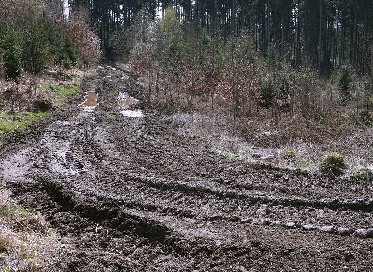 Die negativen Folgen zu hoher Radlasten auf die komplexe und fragile Struktur der Waldböden sind bereits seit mehreren Jahrzehnten bekannt. In der Praxis werden stark beschädigte Rückegassen (Abb. 1) zum Teil auf langer Strecke mit mineralischem Wegebaumaterial ausgebaut oder im schlimmsten Fall sogar durch neue Rückegassen ersetzt. Im häufigsten Fall führen tiefe und durchnässte Fahrspuren jedoch dazu, dass Holzerntemaschinen seitlich versetzt fahren und beschädigte Rückegassen folglich immer breiter werden. Bevor es zu solch drastischen Bodenveränderungen kommt, sollten definitiv schonendere Lösungsansätze in Betracht gezogen werden, um das bestehende Feinerschließungsnetz langfristig zu erhalten. Im Jahr 2018 wurde der "Aufbruchlockerer" OWR MM 100 erneut in einem Projekt der Bayerischen Landesanstalt für Wald und Forstwirtschaft (LWF) und der Professur für Forstliche Verfahrenstechnik der TU München im Wald getestet. Ziel der Maßnahme war, durch das Schaffen von Grobporen die Infiltration von Wasser im verdichteten Bodengefüge zu erhöhen, um die technische Befahrbarkeit der Rückegasse zu verbessern.