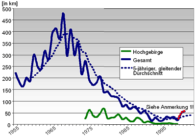 Abb. 1: Die jährliche Wegeneubaustrecke der Bayer. Staatsforstverwaltung. Das Zahlenmaterial entstammt den Jahresberichten der Bayerischen Staatsforstverwaltung.