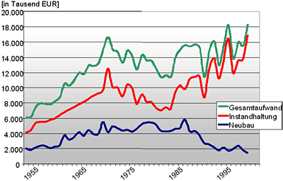 Abb. 3: Entwicklung des Gesamtaufwandes für den Bereich Walderschließung. Das Zahlenmaterial entstammt den Jahresberichten der Bayerischen Staatsforstverwaltung.