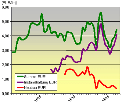 Insgesamt zeichnet sich seit Mitte der 1980er Jahre eine Zunahme der Instandhaltungskosten ab. Interessant erscheint die Kostenbelastung, die sich daraus für jeden Festmeter verkauften Holzes ergibt (Abb. 4). Trotz variierender und in den letzten Jahren ansteigender Holzeinschlagsmengen liegt die Festmeterbelastung im Betrachtungszeitraum etwa zwischen € 3,50 und € 5,50. Eine Optimierung der Wegeinstandhaltung kann dabei gesamtbetrieblich ein nennenswertes Einsparungspotenzial erzielen. In diesem Zusammenhang ist bedeutsam, dass die Wegeinstandsetzung in aller Regel deutlich kostenintensiver ist als der reine Wegeunterhalt.