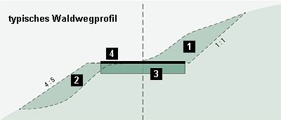 Abb. 4. Typisches Wegeprofil; 1 Abtrag / 2 Auftrag / 3 Tragschicht / 4 Deckbelag