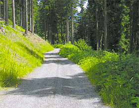 Maschinenweg: Ein Weg ohne Tragschicht, der für einen bestimmten, relativ kurzen Zeitabschnitt gebaut und nach Abschluss der Pflege- und Holzereiarbeit sich selbst überlassen wird.