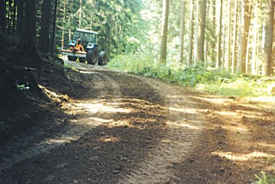 Abschließend ist das in die Mitte der Fahrbahn angehäufte Material auf den gesamten Forstweg zu verteilen. Dazu braucht nur der Schneidewinkel auf etwa 100° zur Wegelängsachse, also leicht schräg, verändert werden. Die Fahrgeschwindigkeit von rund 20 km/h beim Verteilen garantiert, dass das gesamte lockere Material gut auf die gesamte Fahrbahnbreite verteilt wird und gröbere Steine oder auch Äste meist im Straßengraben landen. Normalerweise reicht eine einmalige Überfahrt. Nur bei über vier Meter breiten Forststraßen empfiehlt sich eine zweite Überfahrt.