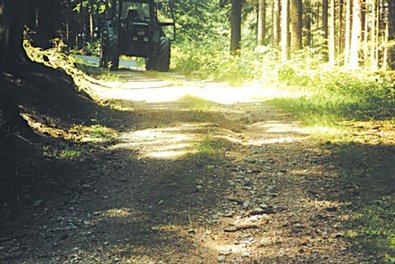 Der größte Teil unserer Forststraßen entstand in den 50er und 60er Jahren des letzten Jahrhunderts oft in Einfachbauweise als sandwassergebundene Schotterstraßen. Von ausschlaggebender Bedeutung erweist sich hier das Dachprofil, das den möglichst raschen Ablauf des Oberflächenwassers vom Wegkörper gewährleisten soll. Eine trockene Forststraße wird auch dem heutigen Schwerlastverkehr ohne Verformung gerecht.