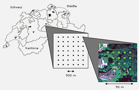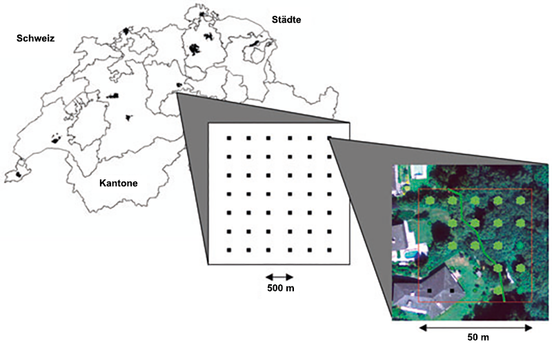 Die Rohdaten wurden schweizweit auf einem regelmässigen Stichprobenetz mit 500 × 500 m Abstand erhoben. Dies ergibt 165'153 Stichproben. Jede einzelne Stichprobe bestand aus einer quadratischen Probefläche mit 50 m × 50 m Ausdehnung. Auf diesen Probeflächen erhoben die Forscher jeweils 5 × 5 Rasterpunkte im Abstand von 10 m (Abb. 2).
