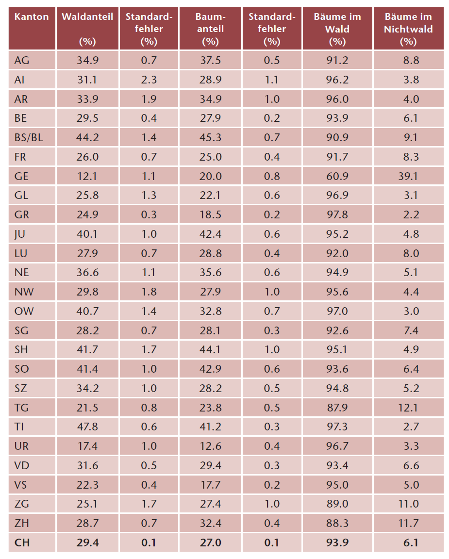 Die Baumbedeckung der Schweiz beträgt gemäss LFI3 27,0%. Darin eingeschlossen sind alle Bäume, unabhängig davon, ob sie im Wald, in der Siedlung oder in der übrigen Landschaft stehen. Der Waldflächenanteil der Schweiz beläuft sich auf 29,4% der Landesfläche. Die Waldfläche ist also grösser als die mit Bäumen überschirmte Fläche. Dies bedeutet, dass es für den Anteil der Bäume im Nichtwaldareal entsprechende Flächen ohne Bäume im Waldareal geben muss (Windwurfflächen, Baumlücken, Schlagflächen, Waldstrassen etc.). Betrachtet man die Lage der Bäume ausserhalb des Waldes, so finden sich diese mehrheitlich entweder in Waldesnähe oder in urbanen Gebieten. Siedlungen sind neben dem Wald der am dichtesten bestockte Raum.