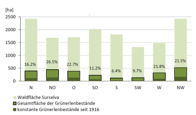 Im Kanton Glarus und im Perimeter der Surselva bestehen aktuell Grünerlenflächen von je über 2500 ha. In den Südtälern des Kanton St. Gallen sind es über 1200 ha Grünerlenbestände. Der aktuelle Grünerlenanteil an der Gesamtwaldfläche beträgt im Kanton Glarus 12%, im Cholschlagtal 19%, im Weisstannental 22% und im Calfeisental 28%. Einzig im Taminatal liegt der Grünerlenanteil unter 5%. Innerhalb des Perimeters der Surselva beträgt der Grünerlenanteil bereits 17% (inkl. der nicht beurteilten Seitentäler wahrscheinlich weit über 30%). Typisch ist in allen drei Untersuchungsgebieten die grosse Verbreitung der Grünerlen in den hinteren Tallagen und im Bereich der oberen Waldgrenze.