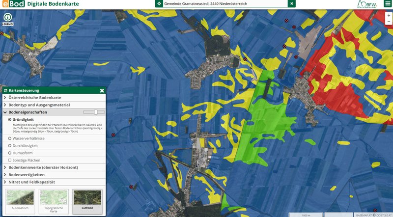 Mit höheren Temperaturen und veränderten Niederschlagsverhältnissen kommt dem Boden eine immer größere Bedeutung im Wasserhaushalt zu. Um Antworten auf zahlreiche aktuelle Fragen liefern zu können, wurde die digitale Landwirtschaftliche Bodenkarte Österreichs eBOD (http://bodenkarte.at) um zusätzliche Themenkarten, beispielsweise zu Bodengründigkeit und Bodendurchlässigkeit, Rasterübersichten (von 1: 5.000.000 bis 1: 30.000) und flächendeckende Farb-Orthophotos erweitert.