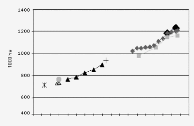 Abb. 2. Zunahme der Waldfläche in der Schweiz in den letzten 150 Jahren. Symbole: Verschiedene Datenreihen. Quelle: U.-B- Brändli (WSL)