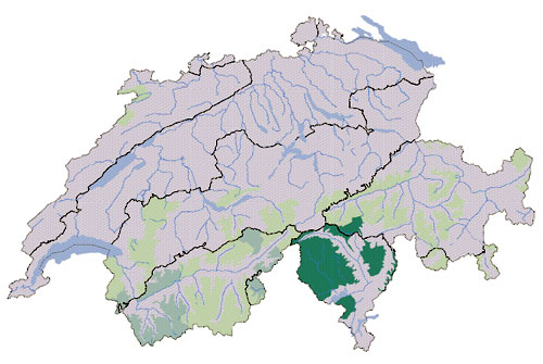 Abb. 3. Nutzungsaufgabe in Wald und Landwirtschaft: hellgrün = gering; mittelgrün = mittel; dunkles Grün = stark. Quelle: Wildnis und Kulturlandschaft, © Pro Natura