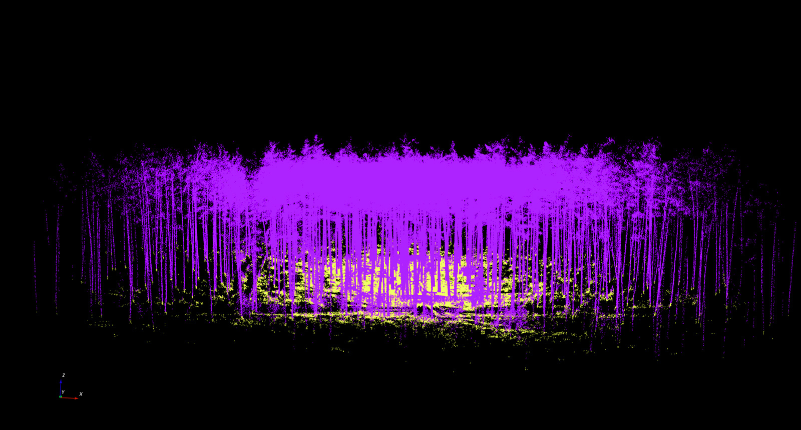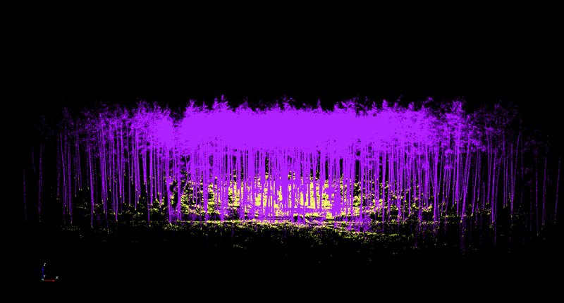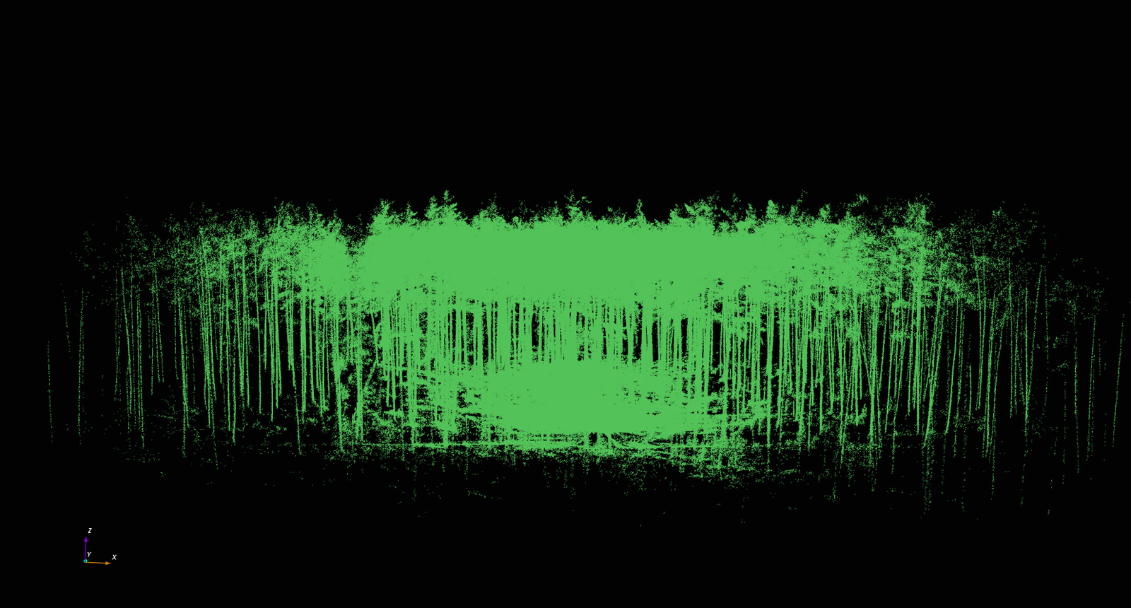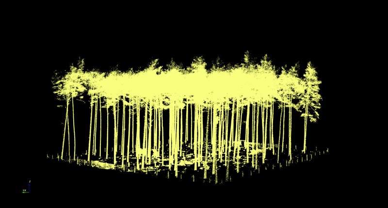 Im nachfolgenden Schritt importiert man die TLS-Rohdaten in das angelegte Projekt über den Menüleisteneintrag "Project – Import – Import Base cloud". An der LWF werden standardmäßig die Originaldaten des Scans sowie ein Export als Textfile (PTS) gespeichert. Die Auswertungen erfolgen grundsätzlich mithilfe der PTS-Datei. Bei der bisherigen Anwendung hat sich gezeigt, dass 3D Forest häufig das Einlesen von sehr großen Dateien abbricht. Um grundsätzlich auch das Arbeiten mit sehr großen Eingabedateien zu ermöglichen, wurde an der LWF eine R-Funktion erstellt, die übergroße Dateien durch Berücksichtigung jedes x-ten Datensatzes verkleinert. Für die hier vorgestellte Auswertung wurde die ursprüngliche Datei von rund 2,4 Gigabyte durch Berücksichtigung lediglich jedes fünften Datensatzes auf rund 500 Megabyte verkleinert. Das Ergebnis nach dem Einlesen findet sich in Abbildung 3. Die dreidimensionalen Daten lassen sich in verschiedenen Blickwinkeln durch Ziehen mit der Maus bzw. kombiniert durch Gedrückthalten der Strg- bzw. Ctrl-Taste und Ziehen mit der Maus betrachten. Durch Gedrückthalten der Umschalt- bzw. der Shift-Taste lässt sich die Punktewolke im Bildschirmausschnitt generell in der Lage verschieben. Mithilfe des Mausrades kann gezoomt werden.