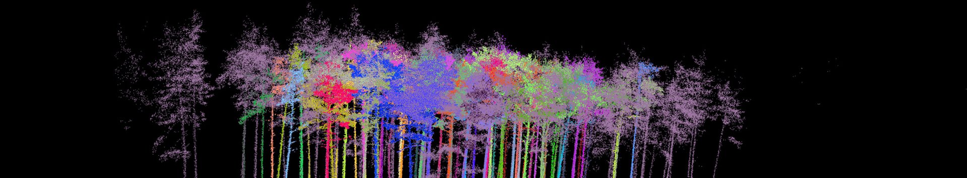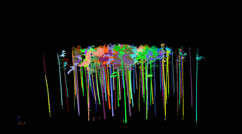 Erstere enthält das Ergebnis der beschnittenen Punktewolke (Abb. 5), die nach Bäumen weiter segmentiert werden muss. Die weitere Segmentierung erfolgt über den Menüleisteneintrag „Vegetation – Automatic tree segmentation“. Es hat sich bewährt, die Voreinstellungen im Dialogfenster "Automatic segmentation" anzupassen sowie im Feld "Input distance" die Werte für "input range in %" abzuändern. Für die Waldklimastation Altdorf wurden Werte von 5 m bzw. 60 % gewählt. Nach Bestätigung der Eingabe wird für jeden segmentierten Einzelbaum eine eigene Punktewolke erstellt und in das Projekt übertragen. Die Überprüfung des Ergebnisses hat sich als sehr zeitaufwändig erwiesen, da das Ergebnis der automatisierten Segmentierung visuell überprüft werden sollte und ggf. alle Baumindividuen einzeln durch Markierung mit der linken Maustaste und Bestätigung der Löschung mit der rechten Maustaste entfernt werden müssen. Abbildung 6 zeigt das Ergebnis der automatisierten Segmentierung für die Fläche in Altdorf. In dieser Teilabbildung sind Fehlklassifikationen enthalten. Diese werden in einem weiteren, zeit- und arbeitsintensiven Arbeitsschritt dadurch eliminiert, dass alle Baumobjekte zur Ansicht deaktiviert und einzeln visuell begutachtet wurden. Fehlklassifizierte Objekte entfernt man aus dem Gesamtdatensatz (linke Maustaste: Auswahl, rechte Maustaste: entfernen und bestätigen mit linker Maustaste).