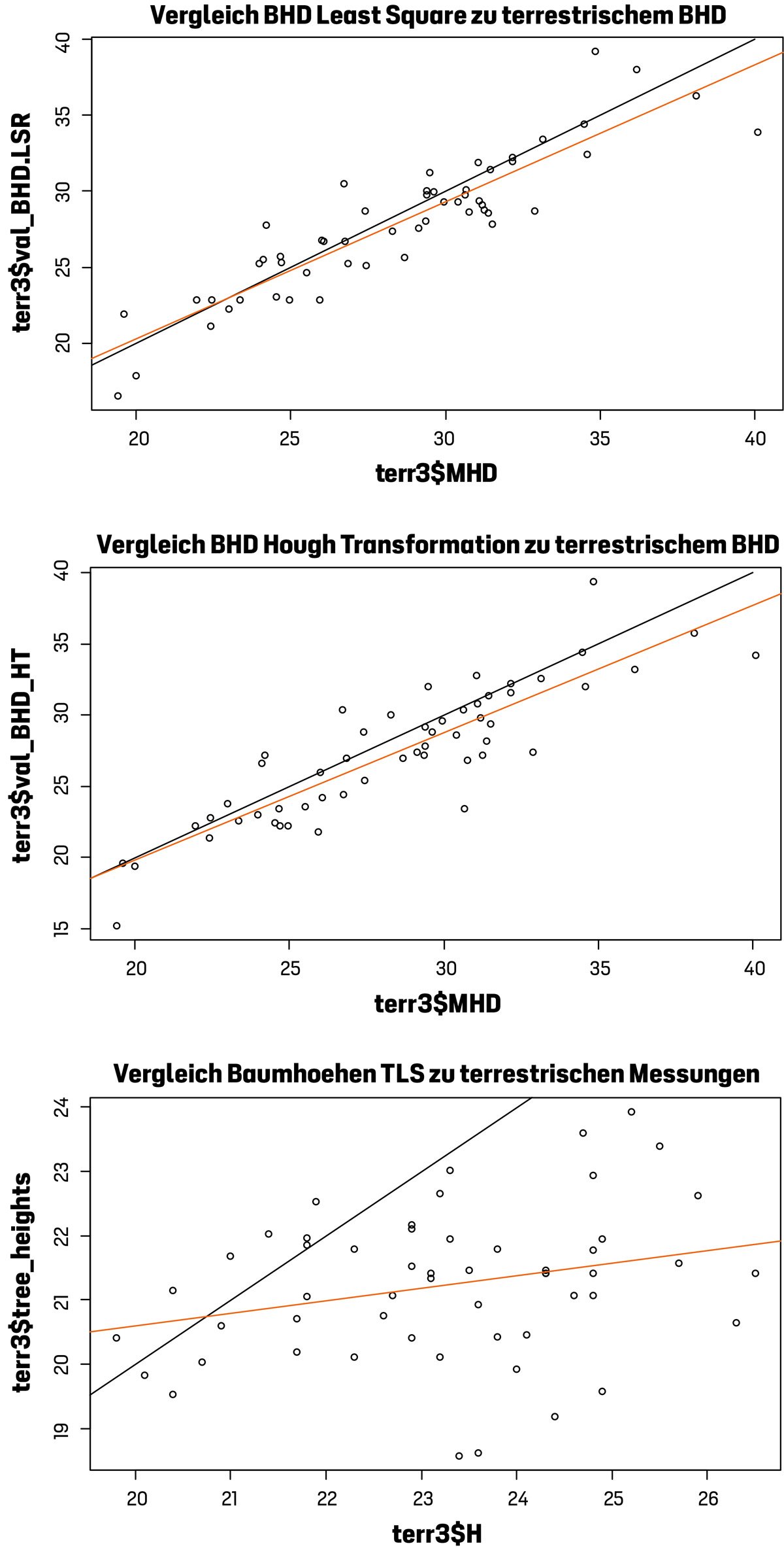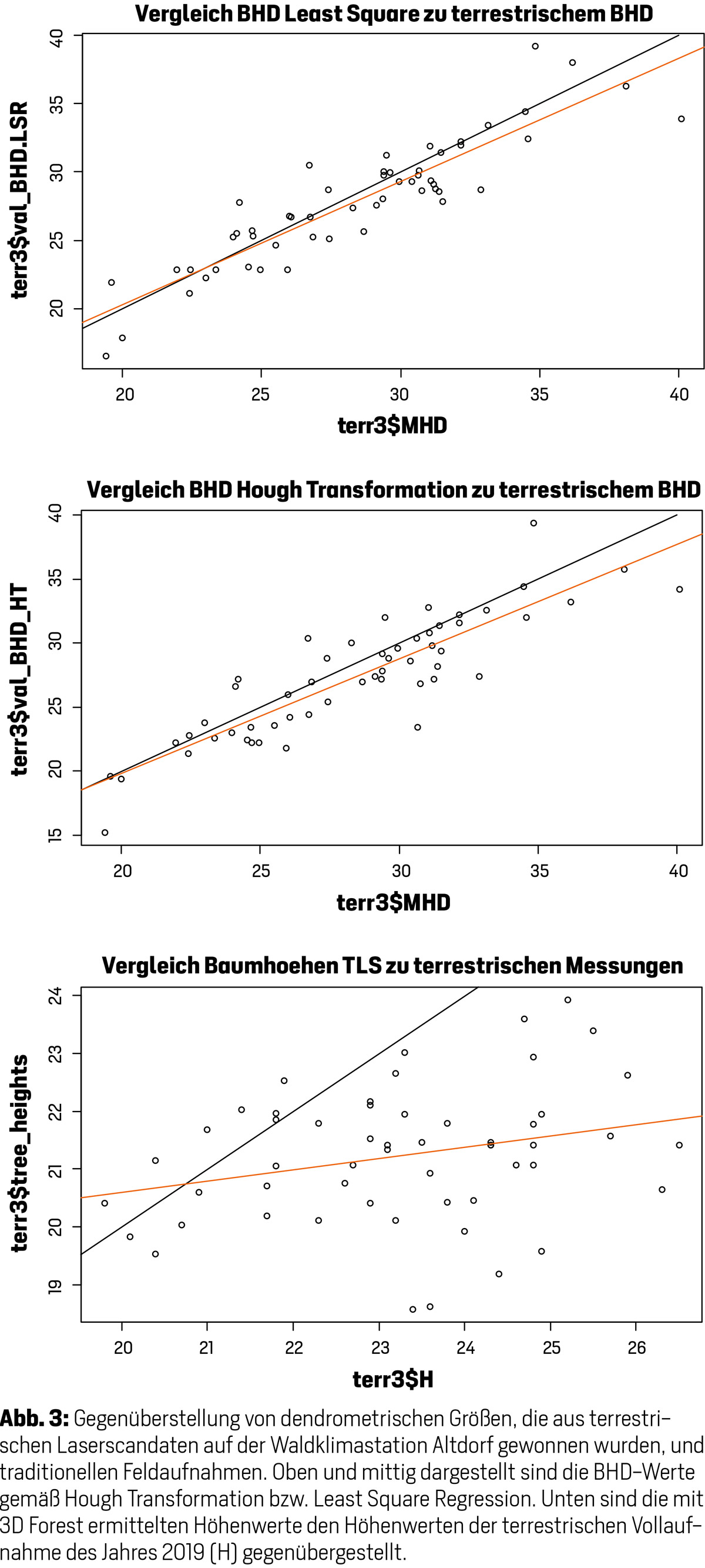 Abb. 8: Gegenüberstellung von dendrometrischen Größen, die aus traditionellen Feldaufnahmen und terrestrischen Laserscandaten auf der Waldklimastation Altdorf gewonnen wurden. Oben und mittig dargestellt sind die BHD-Werte gemäß Hough Transformation bzw. Least Square Regression. Unten sind die mit 3D Forest ermittelten Höhenwerte den Höhenwerten der terrestrischen Vollaufnahme des Jahres 2019 (H) gegenübergestellt.