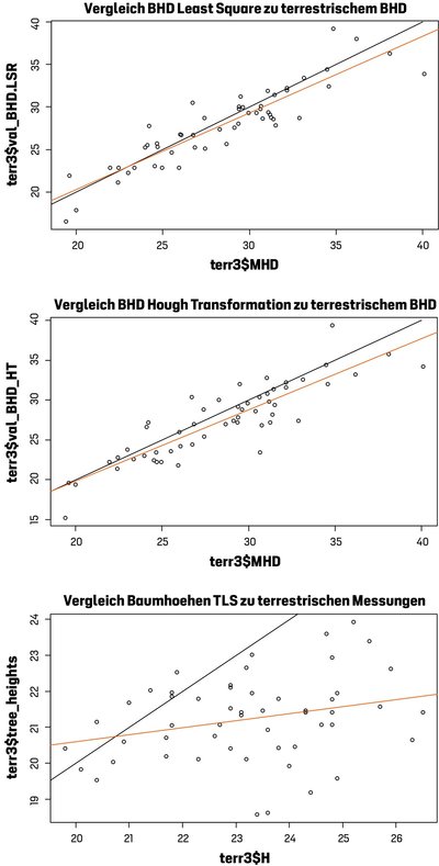 Abbildung 8 zeigt die Vergleiche der automatisiert abgeleiteten Größen für Brusthöhendurchmesser (BHD) und Baumhöhen. Für BHD werden sowohl die mit Kreisanpassung (Least Square Regression, Abb. 8 oben) als auch die mittels Hough Transformation (Abb. 8 Mitte) hergeleiteten Werte gegenübergestellt. Es zeigt sich, dass mit beiden Herleitungsverfahren auf Einzelbaumebene z. T. erhebliche Abweichungen von bis zu 3 cm zwischen TLS-Erhebung und terrestrischer Erhebung bestehen. Dagegen liegen die mittleren Werte von 27,33 cm für Hough Transformations-BHD-Werte und 27,87 cm für Kreisanpassungs- BHD-Werte relativ nah am terrestrisch ermittelten Wert von 28,42 cm. Ergebnisse des Mann-Witney-U-Tests zeigen keine signifikanten Unterschiede zwischen den terrestrischen Daten und den mithilfe des TLS hergeleiteten Daten. In Abbildung 8 unten sind die Werte der aus TLS-abgeleiteten Baumhöhen den terrestrisch erhobenen Daten gegenübergestellt. Zu erkennen ist eine erhebliche Abweichung, insbesondere bei größeren Höhenmesswerten. Dies bestätigen auch die Mittelwert- und Medianvergleiche. Während der mittlere Höhenmesswert bei terrestrischer Erhebung bei 23,27 m für die WKS in Altdorf lag, lag er bei Ableitung aus TLS-Daten bei 21,23 m. Die Unterschiede der Mediane der Verteilungen konnten statistisch gesichert nachgewiesen werden.