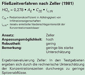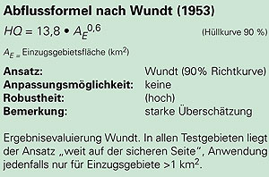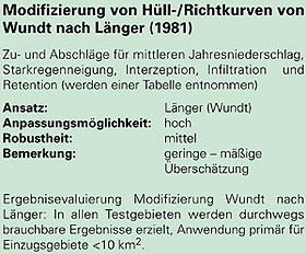 Einzelne Ansätze erreichen trotz diffuser Definition der Adaptierungskoeffizienten und teilweise fragwürdiger Rückschlüsse von Gebietseigenschaften auf deren Abflussverhalten vergleichsweise gute Rechenergebnisse (z.B. Wund modifiziert nach Länger). Die Anpassungsmöglichkeiten an Gebietseigenschaften sind noch gering. Die Anwendung ist einfach und mit geringem Aufwand verbunden, verlangt aber zumindest Grundkenntnisse über Wirkungszusammenhänge und Gebietseigenschaften. Die Formeln reagieren nur gering auf Änderungen der Eingangsgrößen.